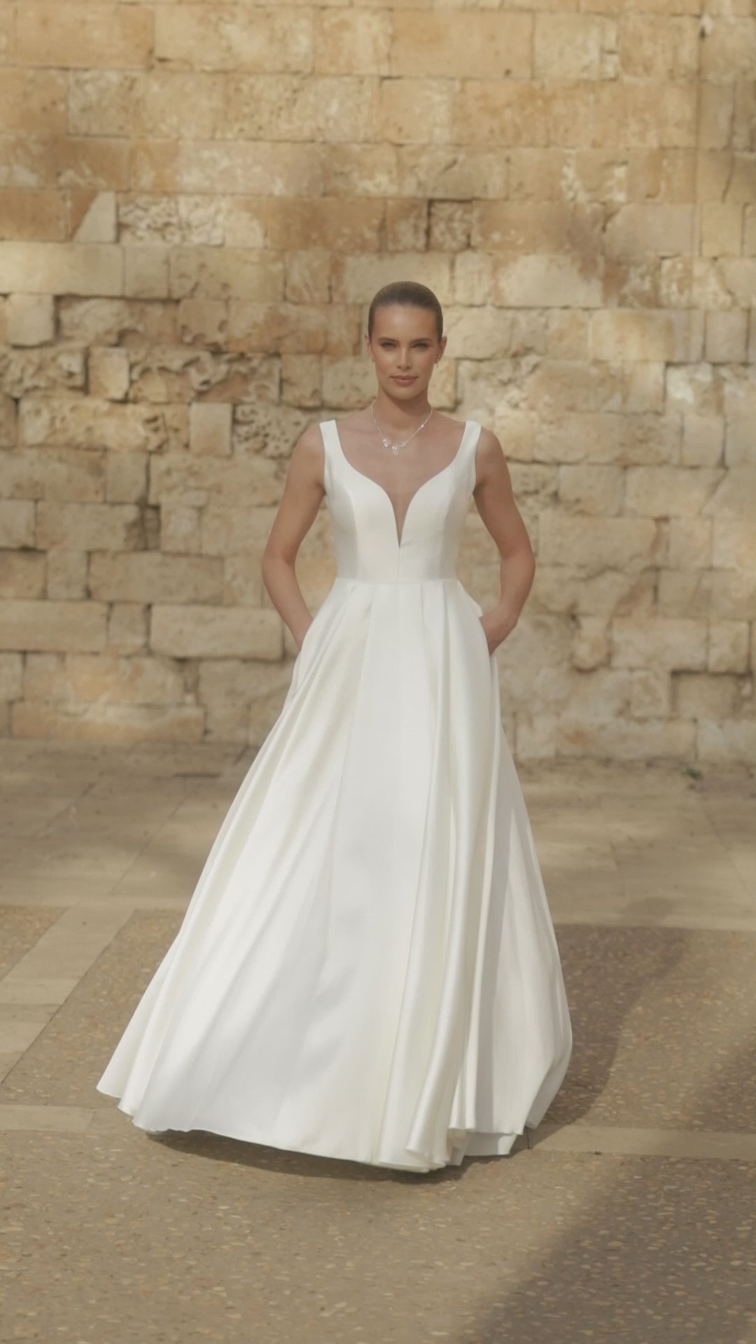 Die Kathedralschleppe, die mit jedem deiner Schritte hinter dir herschwebt, ist ein dramatisches Statement von purem Glamour und verwandelt deinen Weg zum Altar in einen unvergesslichen Auftritt. Deine natürliche Taille wird durch die maßgeschneiderte Passform dieses Kleides perfekt betont, während die eleganten Falten im Rock ein Gefühl von Leichtigkeit und Bewegung vermitteln. Und das Beste daran? Dieses Traumkleid verfügt über praktische Taschen – ein kleines Geheimnis, das dir an deinem großen Tag überraschend viel Komfort schenken wird.