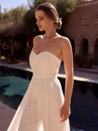 Der Bianco Evento Dove ist mehr als nur ein Jumpsuit; er ist eine Hommage an die moderne Braut. Mit dem stilvollen Taillengurt, der mit einem zarten Knopfverschluss akzentuiert wird, betonst du deine natürliche Taille auf schmeichelhafte Weise und kreierst eine wunderschöne Silhouette. Du wirst dich erhaben und federleicht fühlen, bereit, die Blicke auf dich zu ziehen und zu strahlen.