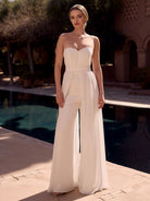 träumst du von einem Hochzeits-Look, der so einzigartig und selbstbewusst ist wie du selbst? Dann lass dich vom Braut-Jumpsuit Bianco Evento Dove verzaubern – ein moderner Traum, der Eleganz und Individualität perfekt vereint! Dieses außergewöhnliche Stück ist gefertigt aus hochwertigem Stretch-Crepe und zartem Chiffon, Materialien, die sich anfühlen wie eine zweite Haut und dir Bewegungsfreiheit für all deine unvergesslichen Momente schenken.