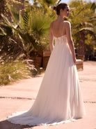 Dein tiefes Dekolleté, umrahmt von perlenbesetzten Spaghettiträgern, verleiht dir eine anmutige Ausstrahlung, während der tiefe Rücken mit V-Ausschnitt eine faszinierende Eleganz besitzt, die alle verzaubern wird. Das liebevoll bestickte Oberteil aus Spitze mit seinem floralen Blumen- und Blättermuster erzählt eine Geschichte von natürlicher Schönheit und zarter Romantik, die dich in den Mittelpunkt rückt. Jeder Faden ist ein Zeugnis der Sorgfalt, mit der dein Kleid in der EU entworfen wurde.