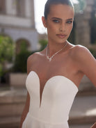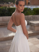 Die halbkathedralische Schleppe schwingt mit jedem deiner Schritte sanft hinter dir her und verleiht dir einen Hauch von Dramatik, während der schicke Schlitz eine moderne Raffinesse einbringt, die deine Beine elegant umspielt und dir zugleich Bewegungsfreiheit schenkt. Simona ist die perfekte Wahl für dich, wenn du an deinem großen Tag eine Balance aus zeitloser Klasse und aufregender Sinnlichkeit suchst.