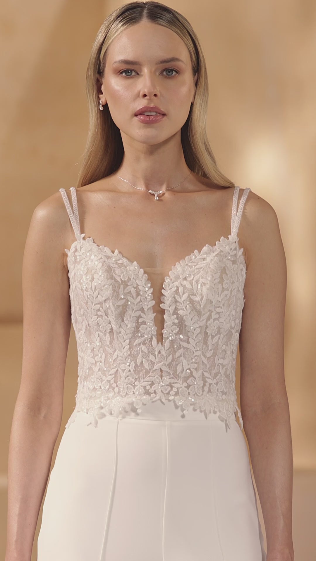 Dieses Spitzen-Top mit zarten Spaghetti-Trägern ist dein perfektes Highlight für den großen Tag. Der tiefe Rückenausschnitt und die herzförmige Vorderseite verleihen dir eine verführerische Eleganz, während der gerade Rücken für einen modernen, femininen Look sorgt. Fühl dich sexy und unvergesslich – genau richtig, um alle Blicke auf dich zu ziehen. Mit diesem Top von Bianco Evento bist du bereit, deine Hochzeit stilvoll und selbstbewusst zu feiern!