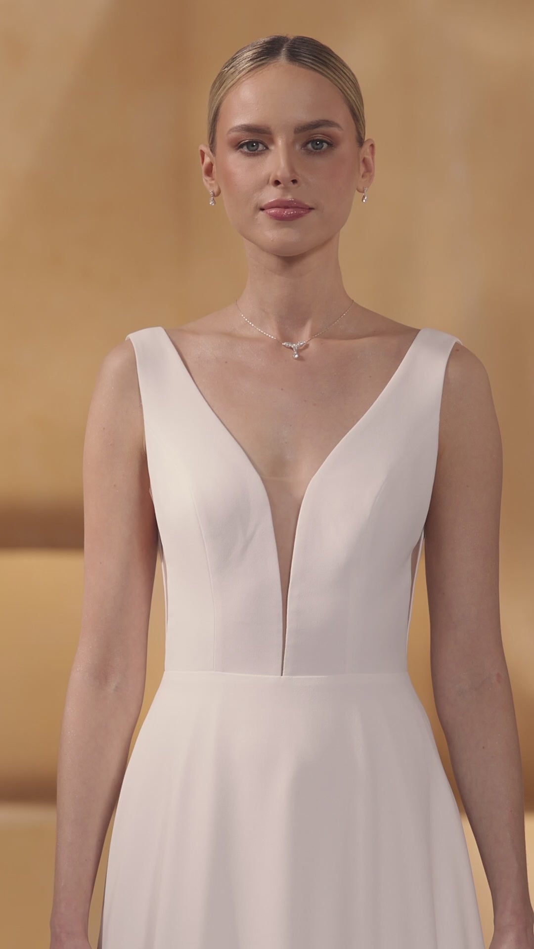 Dieses klassische Hochzeitskleid besticht durch seinen tiefen V-Ausschnitt am Rücken und die schlichte Eleganz aus leicht fließendem Georgette-Stoff. Die saubere A-Linien-Silhouette mit Cutouts sorgt für einen modernen, zugleich zeitlosen Look, der jede Braut strahlen lässt. Ideal für jene, die Understatement mit femininer Raffinesse verbinden möchten.