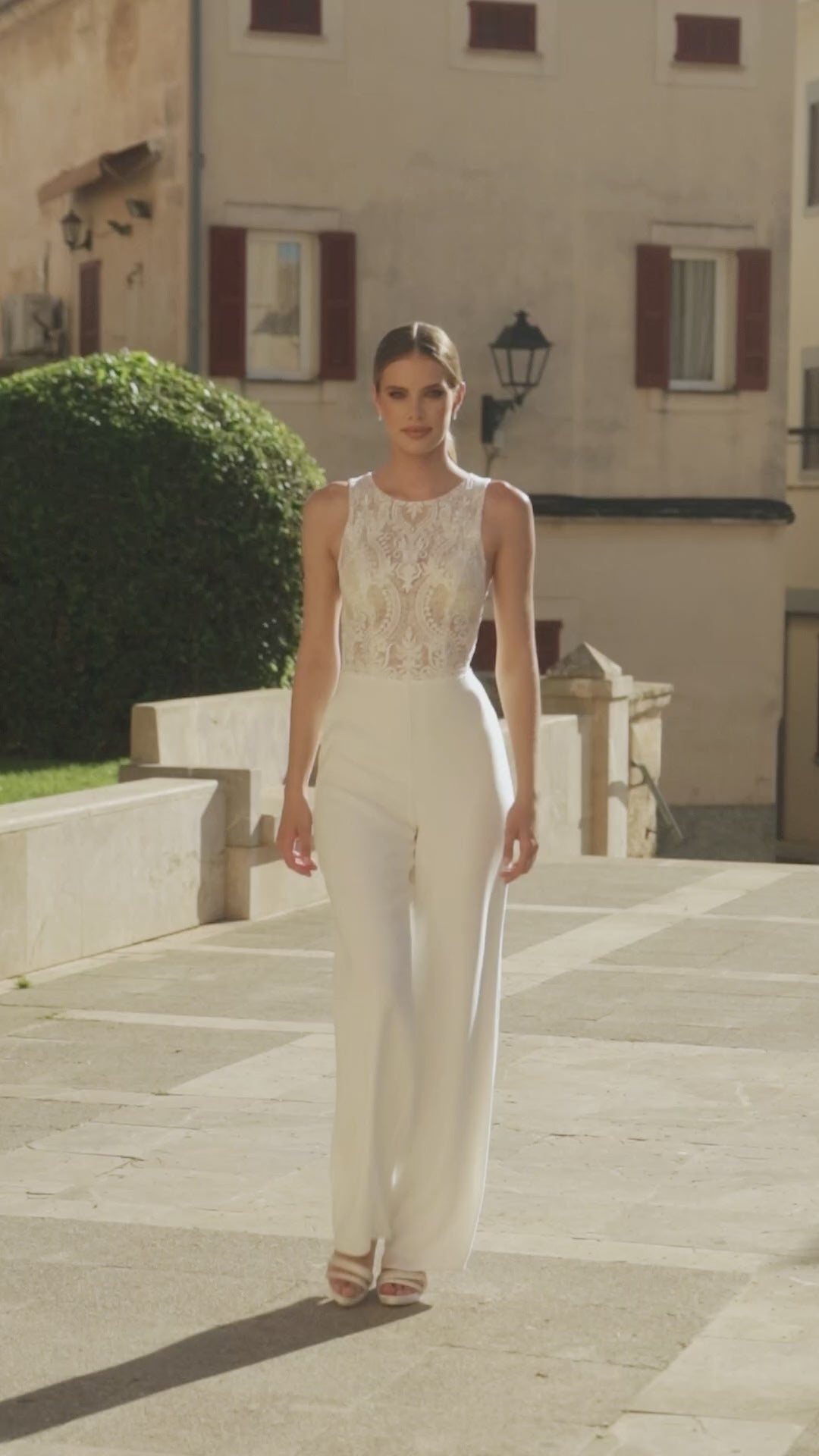 Die Bianco Evento Astrid Jumpsuit vereint Stil und Komfort mit ihrem dehnbaren Crepe-Stoff und dem femininen Spitzenausschnitt. Der hochgeschlossene Rundhalsausschnitt und der rückenfreie Schlüsselloch-Schnitt verleihen dem Jumpsuit eine elegante Weiblichkeit und perfekt für die Hochzeit geeignet.