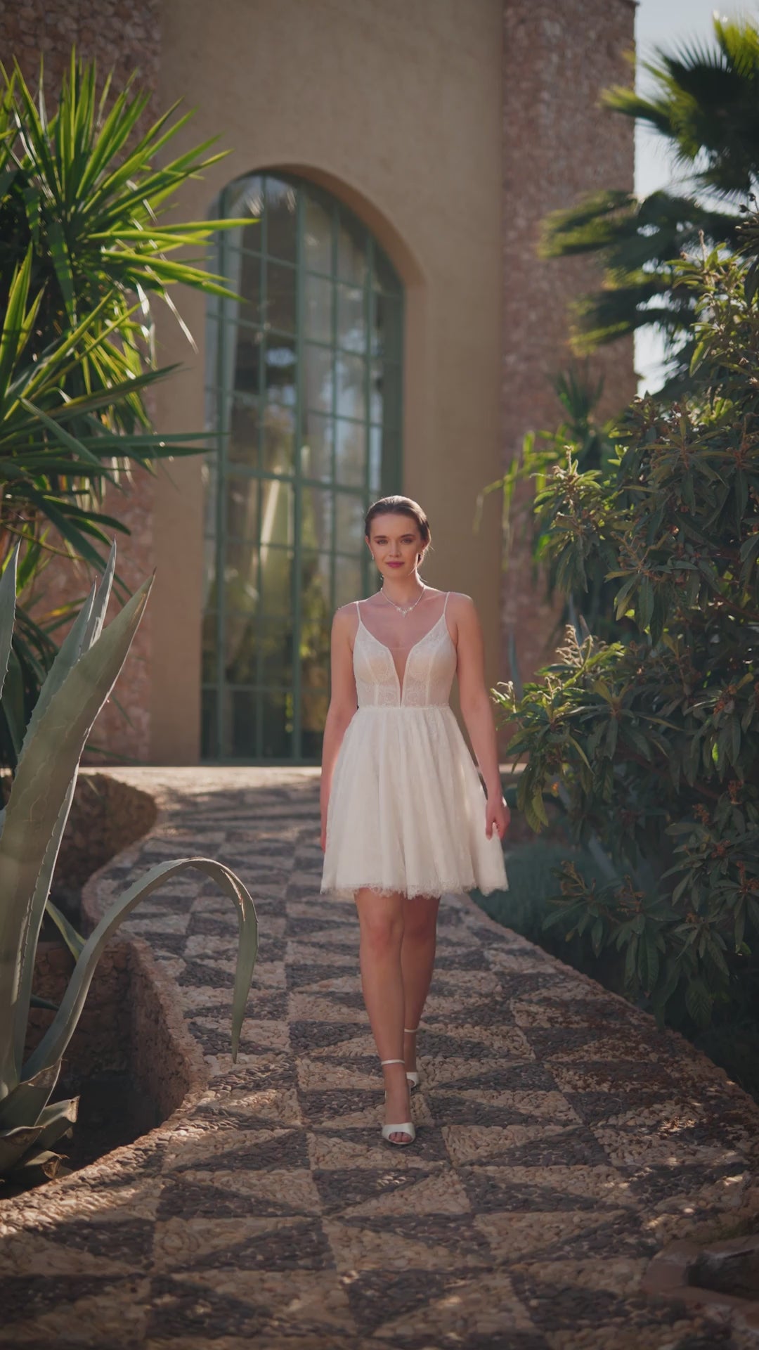 - Modernes kurzes Brautkleid aus hochwertiger Chantilly-Spitze