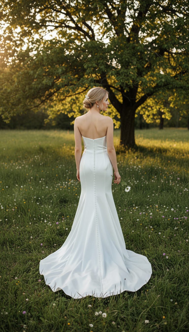Die figurbetonte Fit-and-Flare Silhouette schmiegt sich sanft an deine Taille und fließt in einen ausgestellten Rock aus glattem, mattem Ivory Satin. Der romantische Sweetheart-Ausschnitt vorne und der gerade, clean abschließende Rücken verleihen dem Kleid eine zeitlose, elegante und puristische Ausstrahlung.