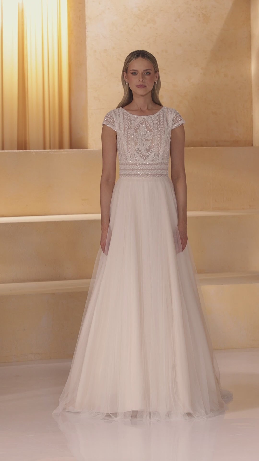 Das Bianco Evento Jopie ist ein wunderschönes Prinzessinnen-Brautkleid im Boho/Vintage-Stil. Gefertigt aus hochwertiger Spitze und reinem Tüll sorgt es für einen einzigartigen Look. Die kurzen Ärmel, der Neckholder-Ausschnitt und der offene Rücken mit Schlüsselloch verleihen dem Kleid eine feminine Note. Mit Kathedralschleppe und natürlicher Taille ist es perfekt für die weibliche, romantische Braut.